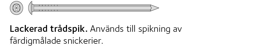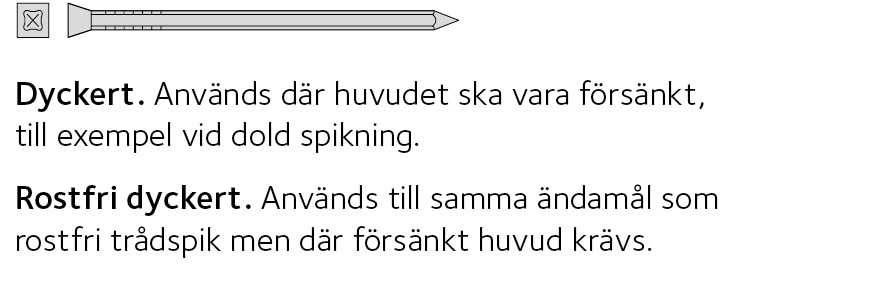 Vid spikning av lister med mera som ska spacklas och målas bör dyckert användas. Använd alltid dyckert vid dold spikning.