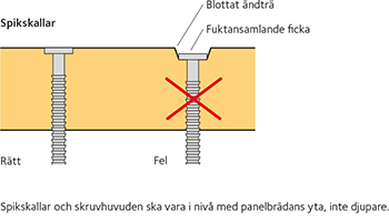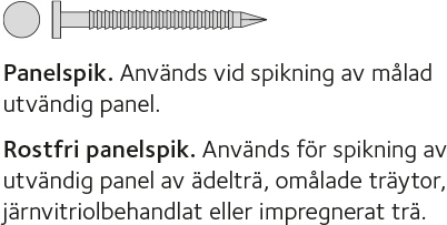 – använd självborrande skruv vid skruvning. - Spikning av utvändig panel med spikpistol bör undvikas eftersom spikarna lätt tränger in för djupt i panelbrädorna och bidrar till fuktinträngning vid spikhuvudet. Detta kan även gälla vid för hårt dragen skruv.