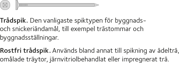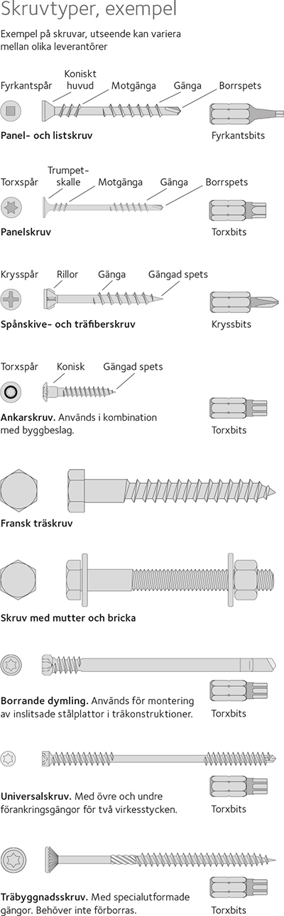 Här finns en mängd exempel på spikar och skruvar, en jämförelse mellan att spika och att skruva, skruvguider och fördjupning i val av rätt skruv vid träbyggande.