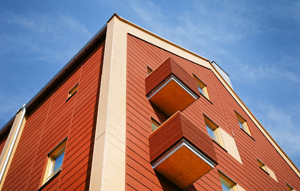 Bärande stomme av korslimmat trä, KL-trä, och träfasad av limträpanel i fem bostadshus i Sundsvall. Fotograf: Svanthe Harström