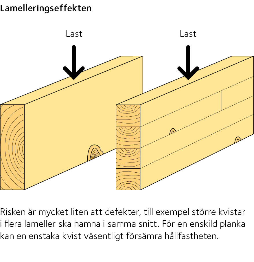 Den höga hållfastheten och styvheten hos limträ möjliggör byggande med stora fria spännvidder. För konstruktionsvirke bestäms hållfastheten hos en enskild planka av det svagaste snittet – vanligtvis vid en stor kvist eller snedfibrighet. Skillnaden i hållfasthet mellan olika plankor kan vara betydande. Element av limträ är genomsnittligt både starkare och styvare än en enskild planka i samma dimension. Detta beror på den så kallade lamelleringseffekten, som i korthet kan förklaras på följande sätt: