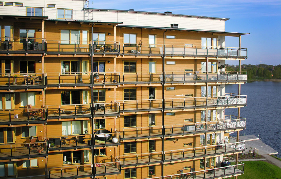 Åtta våningar höga Limnologen i Växjö har en stomkonstruktion av massiva träbjälklag och bärande väggar. Även trapphus och hisschakt är i trä.