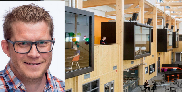 BESTÄLLARE: SKELLEFTEÅ KOMMUN FREDRIK NILSSON, FASTIGHETSCHEF ”Skellefteå Kommun har en lång erfarenhet av att bygga i limträ så det kändes som ett naturligt val för en ny skola. Det ligger också i linje med vår träbyggnadsstrategi för att främja träbyggnation och bidra till ett bättre klimat och samhälle. Vi utvärderar alltid möjligheterna att välja trä om det konstruktionsmässigt fungerar. I detta fall var valet enkelt. Byggnaden är platsbyggd med limträstomme, träfasad och stora delar KL-trä i bjälklag och väggar. Erfarenheterna så här efteråt är enbart positiva. Många boende i området runt skolan tycker att det blev ett riktigt lyft med den nya skolan i trä. Den smälter in väldigt bra med omgivningen och känns välkomnande i till sitt yttre. Och för våra elever och vår personal ger träet ger en varm och välkomnande känsla.”