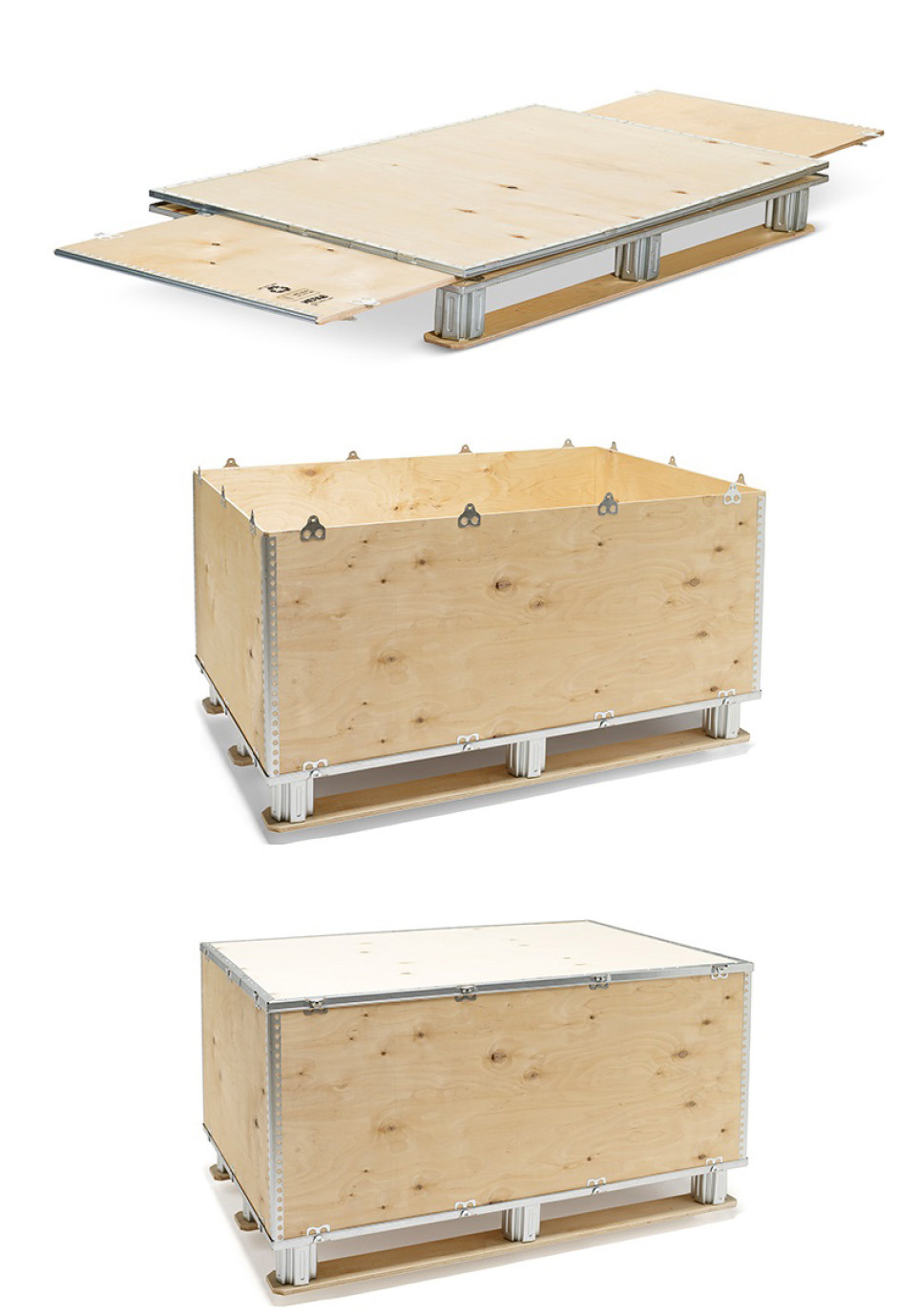 Plywoodlådor lämpar sig för serietillverkning, vid flygfrakt, returanvändning, och behov att komprimera tomma förpackningar