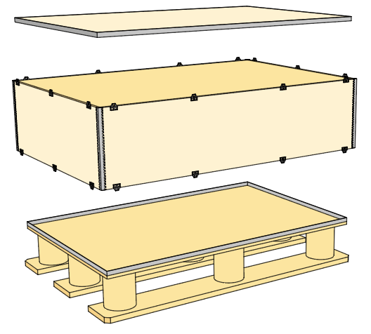 Denna låda ger stora friheter i packningen. Antingen börjar man att ställa produkten på pallen eller pallbotten för att sedan resa upp lådan kring produkten. Eller så monteras 1 gavel och 1 sida upp för att sedan ställa dit produkten och därefter montera lådan.