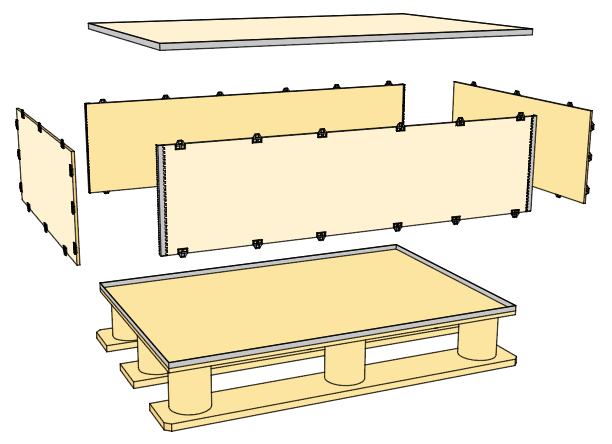Genom att förse botten med medar eller ett pallskelett integreras pallen i lådan.
