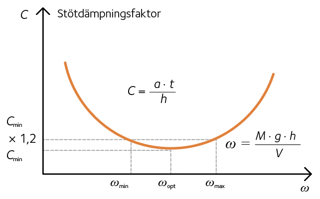 Stötdämpande material kan karakteriseras med hjälp av stötdämpningsfaktorn C och energiupptagningsförmågan per volymenhet ω.