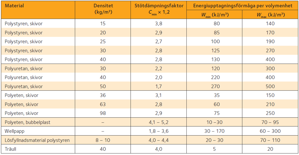 Tabell 4.8 Exempel på stötdämpande materials stötdämpningsfaktor och energiupptagningsförmåga (cirkavärden).