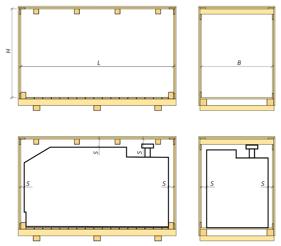 Vid dimensionering av lådor används alltid lådans innermått som utgångspunkt. Säkerhetsavståndet, S, mellan godset och lådans insida bör inte vara mindre än 30 mm. Vid känsliga punkter som kan behöva vadderas eller där barriär ska användas bör avståndet vara minst 50 mm.