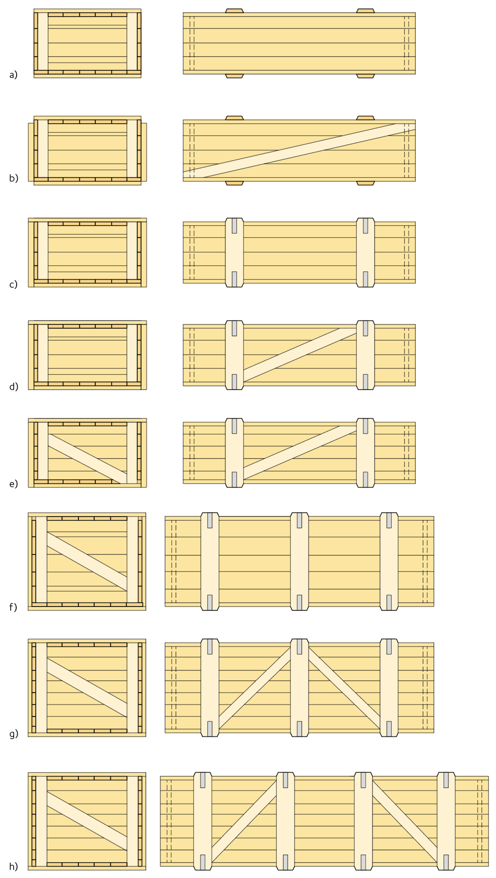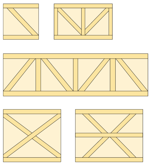 Diagonalt kan lådan förstärkas med strävor, enkla, dubbla eller flera diagonalsträvor för att förhindra skjuvning, diagonal deformation.