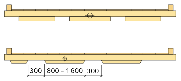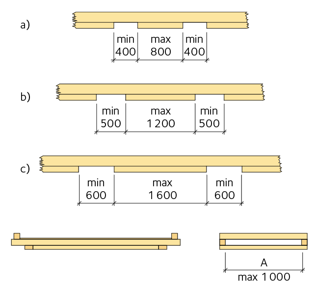 Avstånden mellan nararna är vanligen 1 000 – 1 300 mm, ibland upp till 1 800 mm. Överhänget kan vara upp till 800 mm. Riktlinjer för snedsträvning visas i figur 4.17.