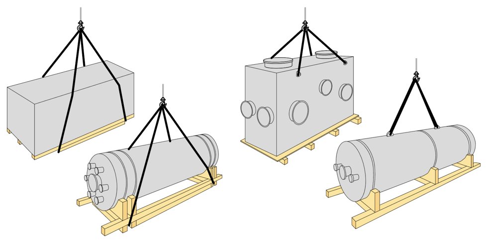 Figur 4.1 Olika slags gods som hanteras genom lyft i emballaget (till vänster) eller i godset (till höger).