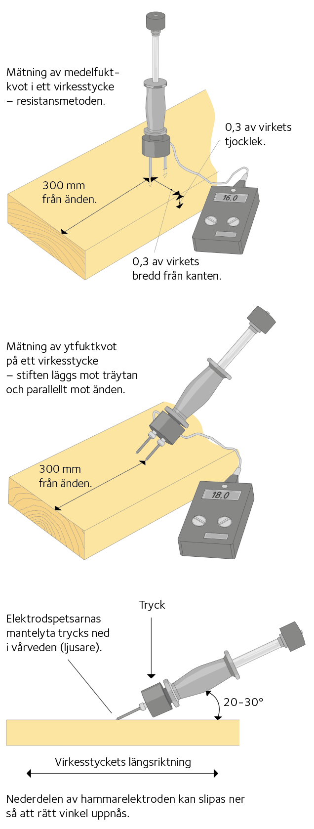 Ett mer praktiskt sätt, men inte lika noggrant, är att använda en elektrisk resistansfuktkvotsmätare med isolerade hammarelektroder och mäta ytfuktkvoten i en viss punkt vid ett djup på 0,3 gånger virkestjockleken. Ytfuktkvoten är viktig att kontrollera före inbyggnad eftersom den är avgörande när det gäller risk för mikrobiell påväxt. Mätningen utförs på ett antal virkesstycken i samma parti för att få fram ett korrekt medelvärde. Detta mått anses representera tvärsnittets medelfuktkvot.
