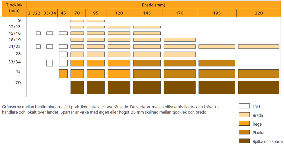De hållfasthetsklasser som är markerade med orange färg är tillverkningsstandard för svenska producenter av hållfasthetssorterat konstruktionsvirke.