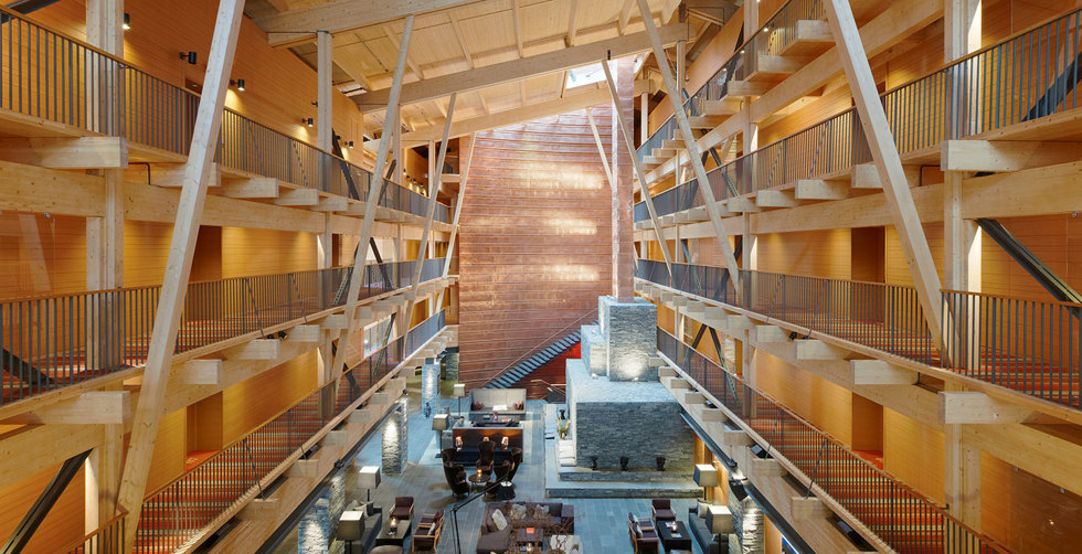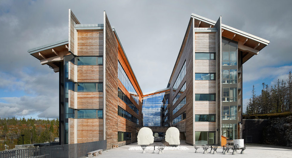 Nästan 730 meter över havet tronar det mäktiga fjällhotellet Copperhill Mountain Lodge med storslagen utsikt över Åres fjällvärld. Arkitekturen präglas av trä både utvändigt och invändigt och materialiteten framhävs av ytornas behandling oavsett om de är lämnade råa eller slamfärgsmålade. Den stora lobbyn med synlig limträstomme och bjälklag av masivträ är intagande med sin volym och sitt stora inslag av trä. Som kontrast mot den svarta slamfärgen och golvets skifferbeläggning understryks i interiörerna en varm färgton i trä genom väggar och tak i oregonpinepanel.