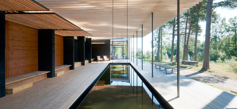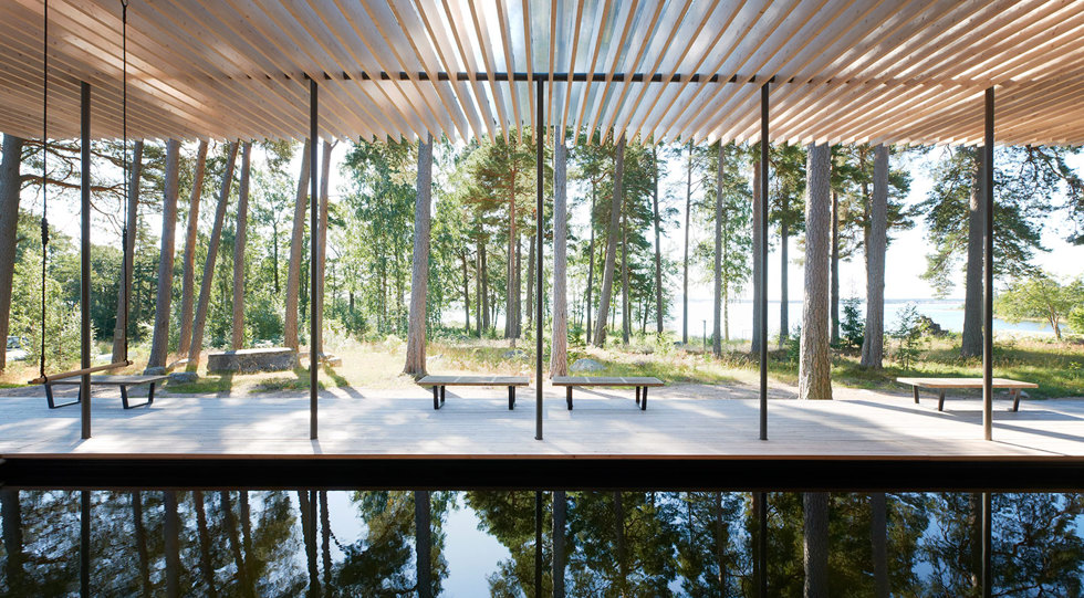 Den smala paviljongen på halvön Norrlandet utanför Gävle bjuder på en upplevelse som hämtat sin näring från skogskojor och nordiska timmerhus, 1970-talets gillestugor, men framförallt från själva platsen och den sekelgamla helhetsmiljön. Byggnaden skapar ett arkitektoniskt gestaltat skogsbryn där massivträstrukturen står lätt i skogsmarken på platsgjutna betongplintar. Massivträskivorna bilder också scenografi för badupplevelsen där man på ett trädäck av kärnfuru rör sig fritt mellan ute och inne mot skogen och havet.