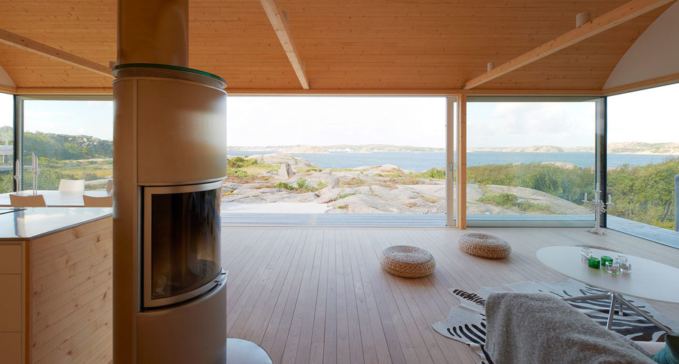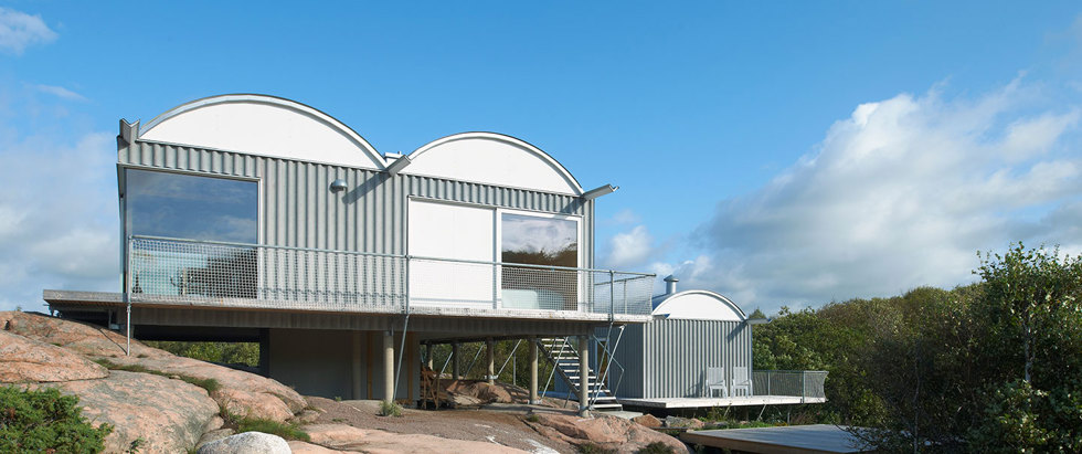 En byggnadskropp sammansatt av två tunnvälvda volymer på en plattform lyft över de Bohusländska klipporna är ett exempel på förnyelse av modern skärgårdsarkitektur. Den platsbyggda trästommen av massivt konstruktionsvirke och stolpar och balkar av limträ, har fått en närmast underhållsfri, mineralisk utsida. Till skillnad från de yttre materialen är byggnadernas inre rum helt av trä. När solen står lågt i väster blir den grå byggnaden i det granitgrå landskapet ett glödande blickfång från havet.