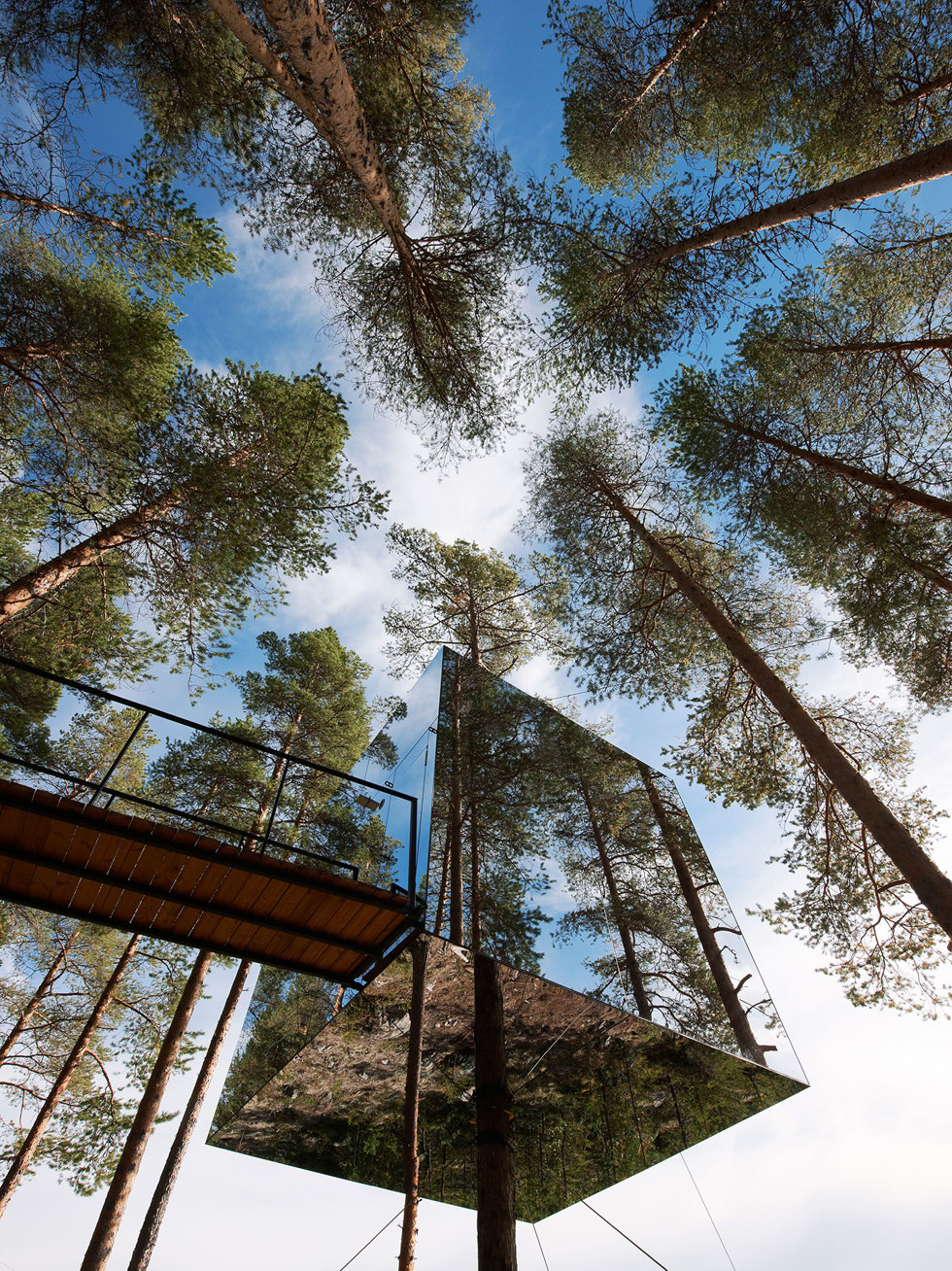 Spegelkuben The Mirrorcube är den mest spektakulära av de sex trädkojor som utgör Treehotel i Harads norr om Boden. Ett uppiggande hotellkoncept som genom en stor portion lekfullhet visar på träets mångfacetterade uttrycksmöjligheter. Mirrorcube är en spegelglasklädd kub som spänts upp kring en trädstam och likt en kameleont smälter in i den omgivande naturen. Interiören domineras av furuplaywood som står i kontrast till den bärande tallstammen.