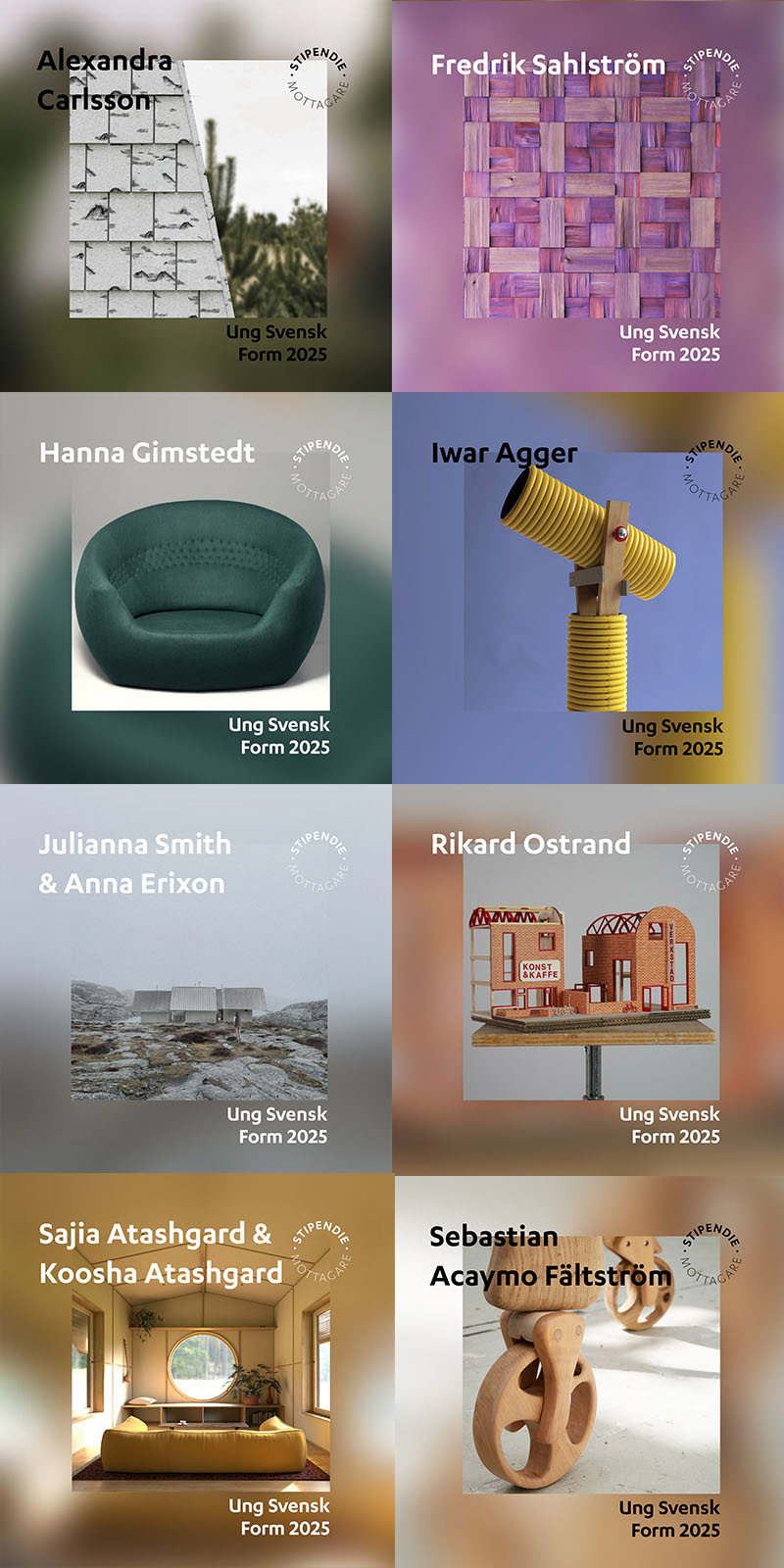 Den 4 februari tillkännagavs de åtta bidrag som tilldelades Svenskt Träs stipendium i Ung Svensk Form-tävlingen 2025. Vinnarna av stipendiet får ta del av en inspirations- och kunskapsresa, där de får nätverka och få fördjupad förståelse och kunskap om materialet trä och hur det kan bidra till en hållbar utveckling. Under tre dagar får de besöka olika aktörer kopplade till träindustrin och ta del av innovativa projekt.