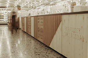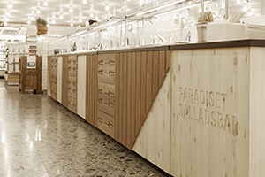 När branschorganisationen Svenskt Trä samarbetar med matbutiken Paradiset inför nyöppningen av butiken på NK skapas en butiksupplevelse med innovativt framtidstänkt där hälsa och hållbarhet står i fokus. Genom att använda furu från svenska skogar i inredningen får varumärket den inramning som man strävar efter.