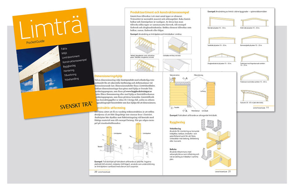 "Limträ PocketGuide" är en fickhandbok på 36 sidor (A6-format) som innehåller fakta och anvisningar om limträ. Byggentreprenören, hantverkaren eller konsumenten får genom pocketguiden all väsentlig information om limträ - uppbyggnad, produktsortiment samt en hel del tekniska råd och anvisningar för tillämpning och användning.