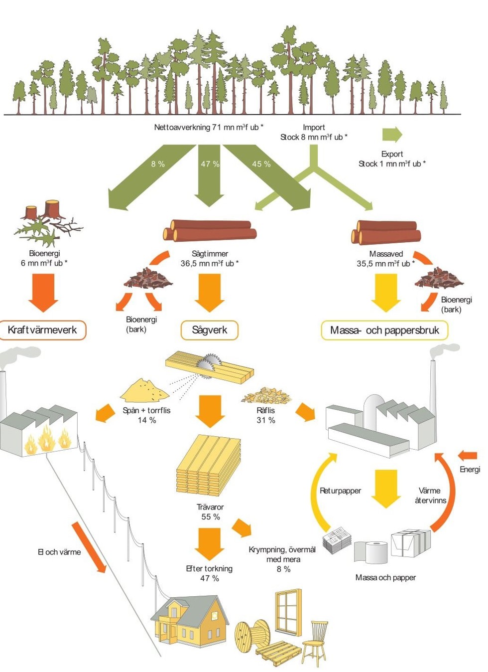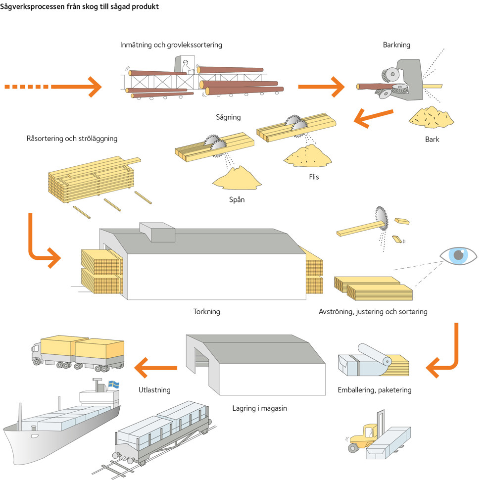 Flödet från stock till färdiga produkter framgår av figuren på sågverksprocessen till höger. I sågverket tas hela stocken till vara.