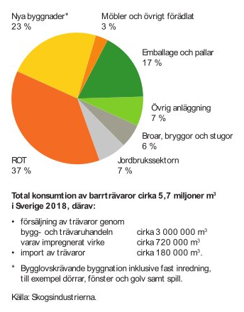 - Det största användningsområdet är renovering, ombyggnad och tillbyggnad, ROT. Detta område står för 37 procent av trävarukonsumtionen och innefattar både ”Gör det själv” och professionell verksamhet. Distributionen till ROT sker nästan uteslutande genom bygghandeln. ROT är ett användningsområde som vuxit under senare år och står alltså för en ökande andel av den totala träkonsumtionen. Alla typer av träprodukter som används till renovering och tillbyggnad ingår i denna kategori; allt från byggnadsvirke, inklusive impregnerat virke, till olika typer av inrednings-