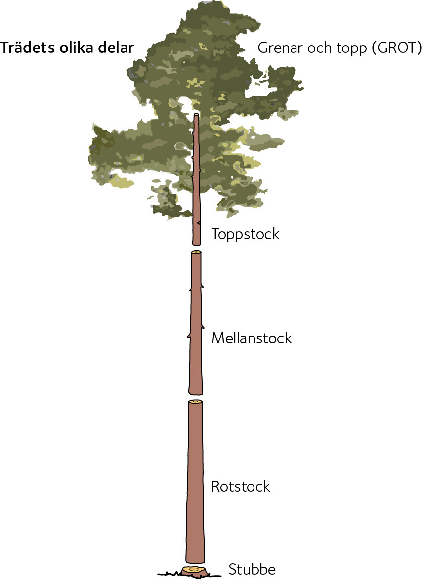 När ett träd är moget för avverkning och har fällts, kvistas och kapas stammen vanligtvis i rotstock, mellanstock, toppstock och en till tre massavedsbitar. Grenar och toppar, så kallad GROT, kan samlas in för att flisas och sedan användas som skogsbränsle. Mindre träd, som fälls till exempel vid gallringar, kapas till massaved eller blir klentimmerstockar (toppdiameter 120 – 200 mm).