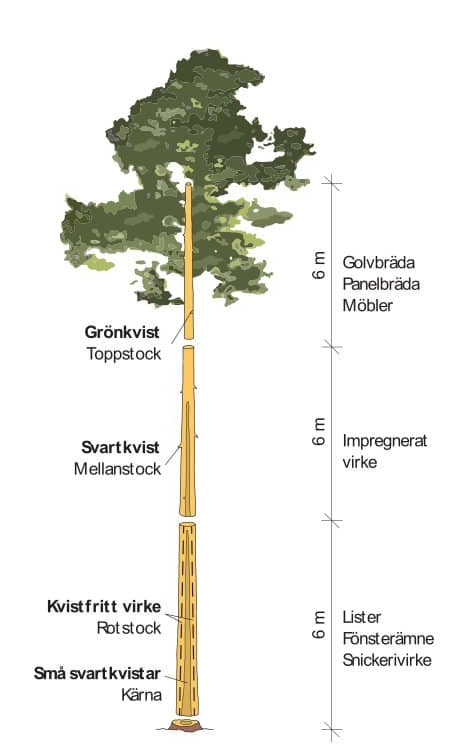 Gran är det träslag som i första hand används till konstruktionsvirke. Till snickerier, lister och invändiga paneler används vanligen virke från furu men även gran kan användas. Lövträ, till exempel ek och bok, används i golvbeläggningar och i möbler.