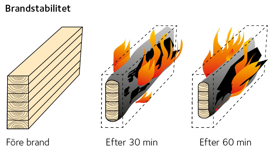 Träkonstruktioner har bra brandtekniska egenskaper. Trä förkolas långsamt och under den förkolade ytan finns normalt trä, som bibehåller sina ursprungliga egenskaper. Förkolningshastigheten är cirka 0,5 – 1 mm per minut. Större dimensioner och skydd av träytan innebär att träkonstruktionens brandmotstånd kan bli högre.