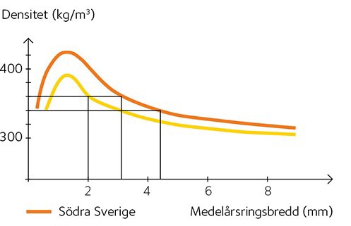 Figur 25 Årsringsbreddens och det geografiska lägets inflytande på torr-rådensiteten, ur en teoretisk betraktelse Virke från södra Sverige är generellt tyngre, starkare och har högre hållfasthet än virke från norra Sverige. Detta trots att sydsvenskt virke generellt sett har bredare årsringar än virke från norra Sverige. Anledningen är att sommarvedsbandet, den mörka delen av årsringen, är bredare i södra Sverige. Sommarveden, som väger 900 kg/m3 torr ved, är 3 gånger tyngre än vårveden, den ljusare delen av årsringen, som väger 300 kg/m3 torr ved.