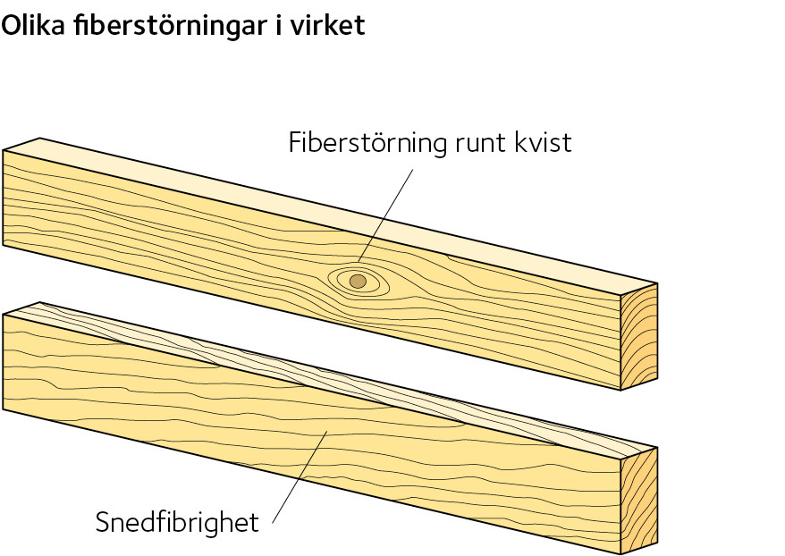 Fiberriktningen avviker från krafternas riktning vid kvistar och då fibrerna inte är parallella med virkets kant.