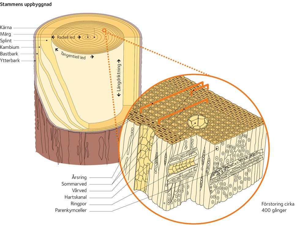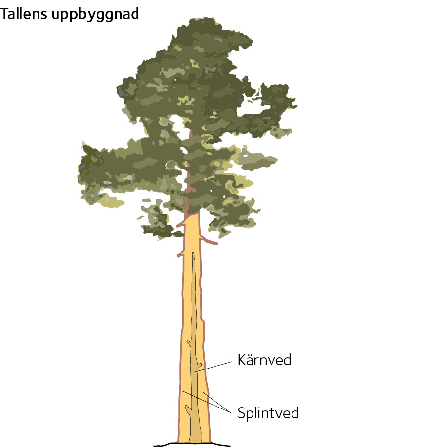Tall och gran är uppbyggda på ett likartat sätt. I centrum av stammens tvärsnitt finns märgen som går genom hela trädet och slutar i toppen med en knopp. Märgen omsluts av veden, som kan delas in i kärna och splint. Cellerna i kärnan är döda och en del har täppts till av hartser, vilket medför att de inte kan leda vatten och alltså har relativt låg fuktkvot, 30 – 50 procent. Även splintvedens celler är döda sånär som på 5 – 10 procent av de näringsledande så kallade parenkymcellerna.