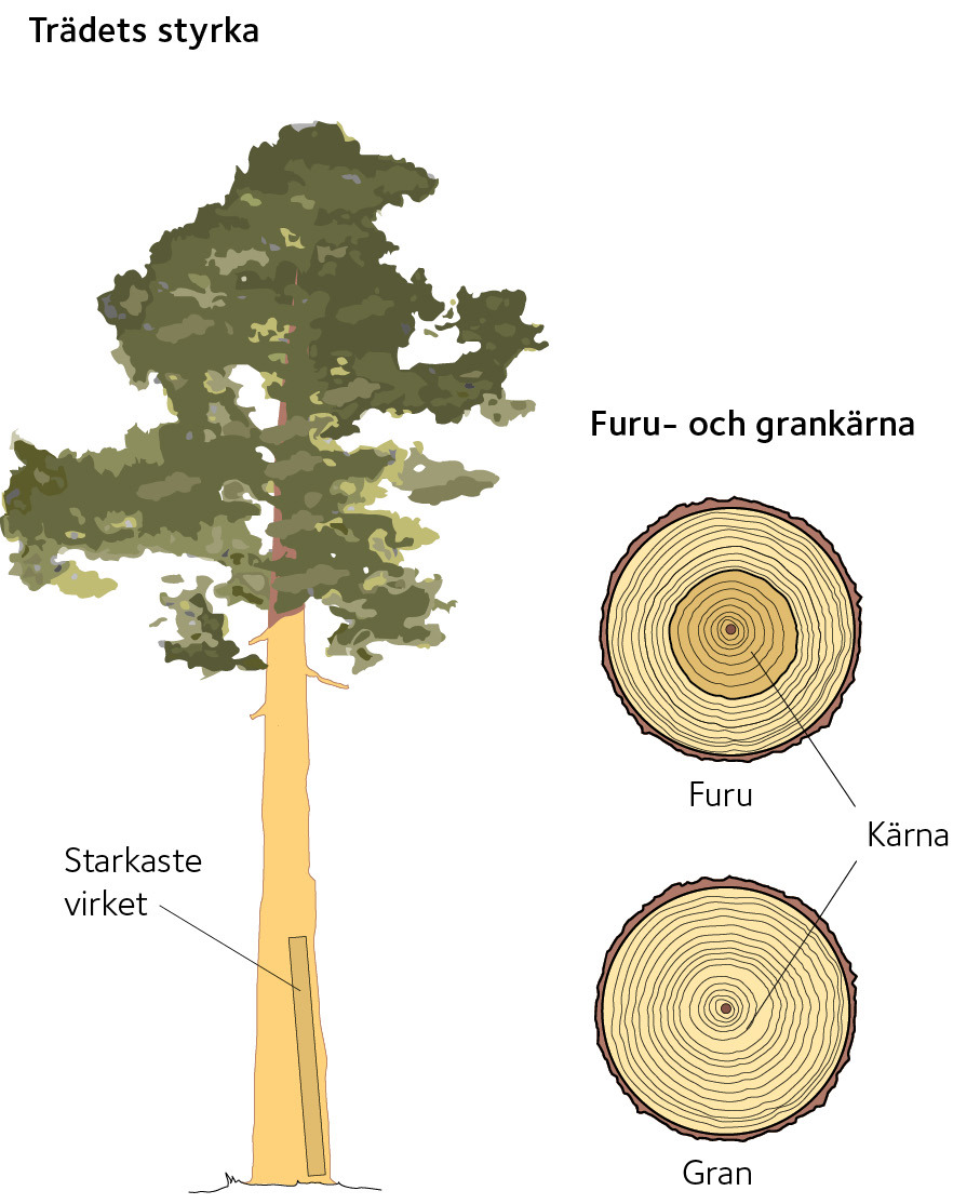 Från hållfasthetssynpunkt behandlas furu och gran lika, de bestäms normalt till samma hållfasthetsvärden: