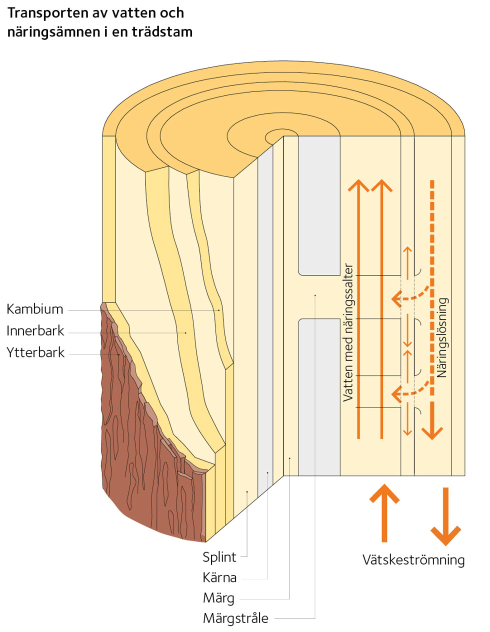 Eftersom splintvedens celler inte täppts till av hartser leder dessa celler vatten, med däri lösta närsalter, från rötternas rothår till trädens barr. Splintvedens fuktkvot varierar mellan 120 och 160 procent. Utanför veden ligger kambiet som är stammens tillväxtlager. Kambiet producerar vedceller inåt och barkceller (korkceller) utåt. Kambiet omsluts av bastbarken (floemet), vilket ofta brukar kallas innerbarken. I detta skikt transporteras näringen (kolhydrater) ned genom stammen och fördelas till de levande cellerna i trädets grenar, stam och rot. Bastbarken står i förbindelse med märgen genom märgstrålar, som är levande i splintveden men döda i kärnveden. Ytterbarken omsluter hela stammen och utgör ett skydd mot uttorkning och olika parasiter.