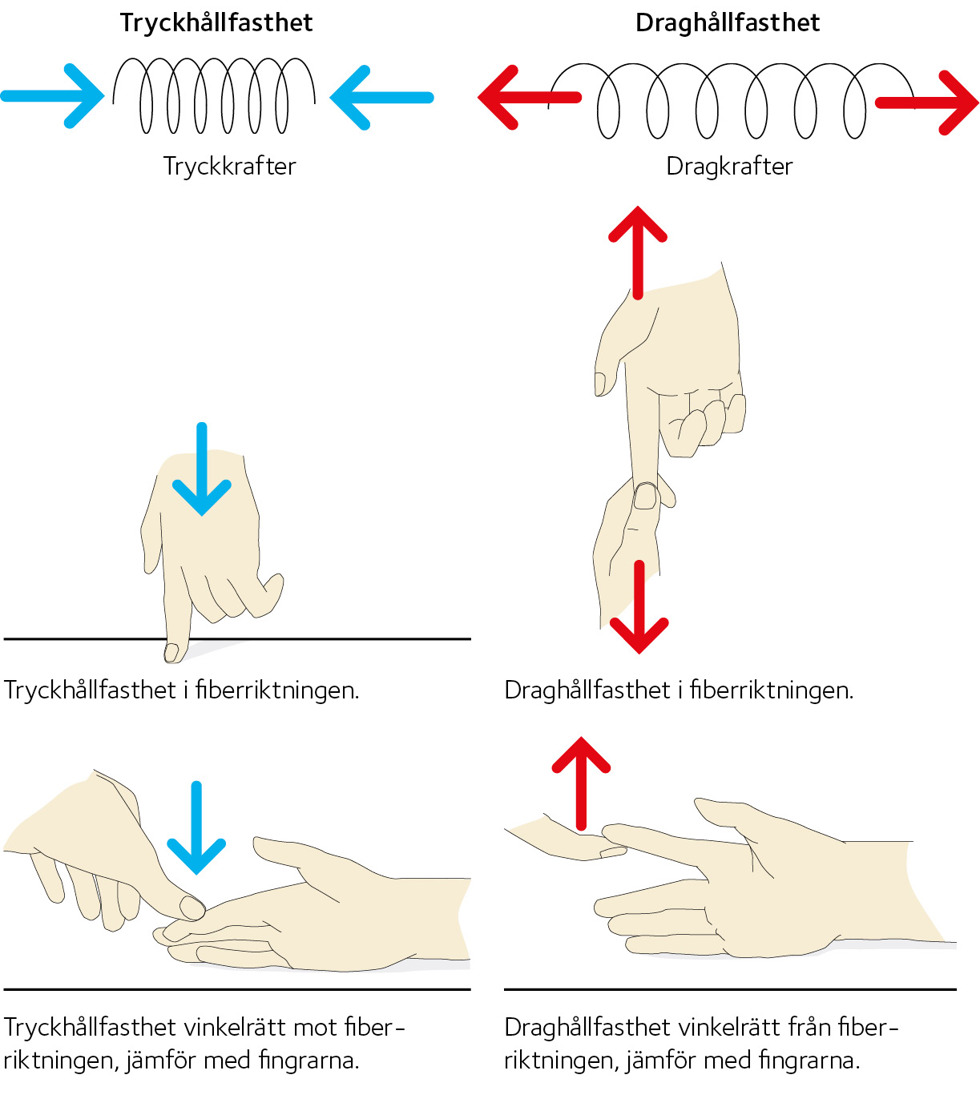 - Tryckhållfastheten är hög i fiberriktningen men betydligt lägre, cirka 1/6-del, tvärs fibrerna