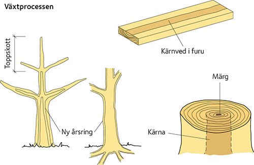 Årsringens bredd och andel sommarved varierar inom stammen.