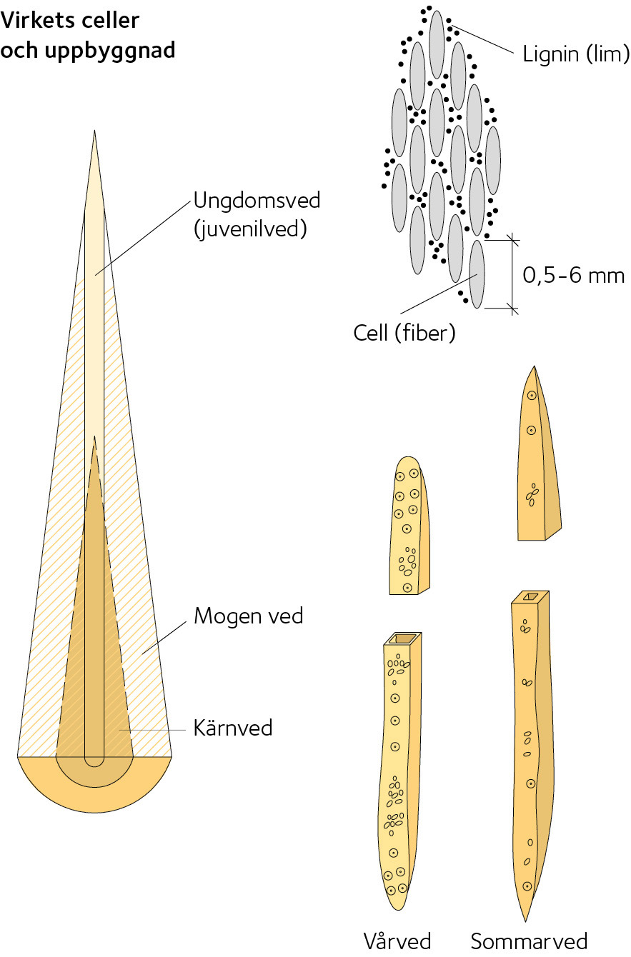 Till övervägande del, 90 – 95 procent, består veden av långsträckta och ihåliga celler, som inom skogsindustrin kallas fibrer. Dessa fibrer är tunna som hårstrån och varierar i längd mellan 0,5 till 6 mm. Övriga celler är kortare och tunnväggigare.
