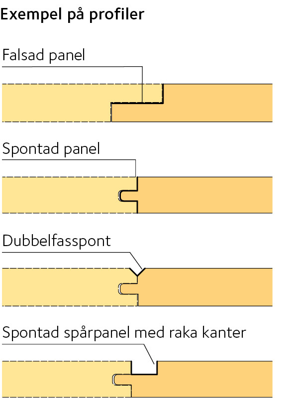 De dimensioner och profiler som redovisas på följande sidor är enligt standard SS 232812 (trälister), SS 232813 (spontat virke) samt i Svenskt Träs produktkatalog traprodukter.se. Utöver dessa kan bygghandlarna ha andra dimensioner och speciella profiltyper.