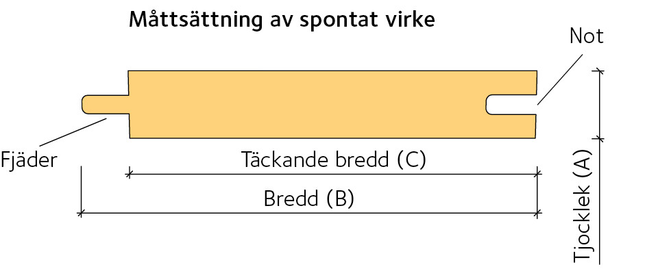 Spontat virke och profilerade lister benämns i handelsledet med totala bredden (B). I svensk standard anges för dessa varor i stället täckande bredd (C). Underlagsspont 23 × 95 mm i handelsledet kallas således i svensk standard 23 × 85 mm.