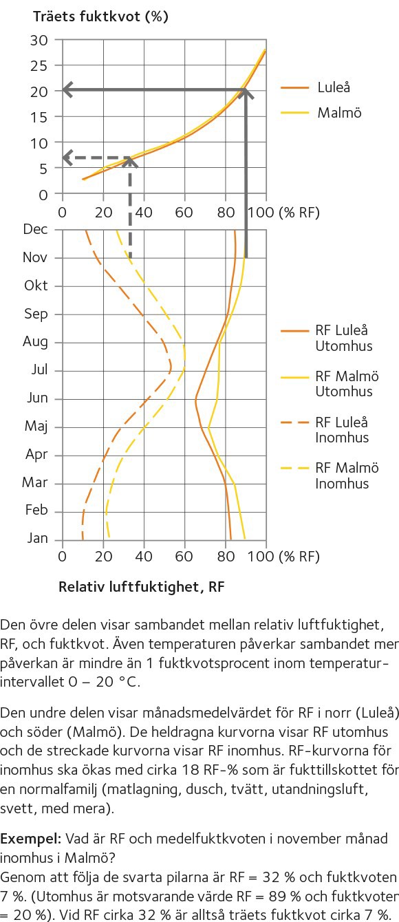 Fuktkvoten i trä, såväl inomhus som utomhus, anpassar sig till omgivningens relativa luftfuktighet och temperatur. I uppvärmda svenska bostäder i Mellansverige är fuktkvoten i virke under hela året i medeltal 7,5 % och den är högst sommartid (7 – 12 %) och lägst vintertid (2 – 6 %). I genomsnitt är det torrare i norra än i södra Sverige, se figur 45.