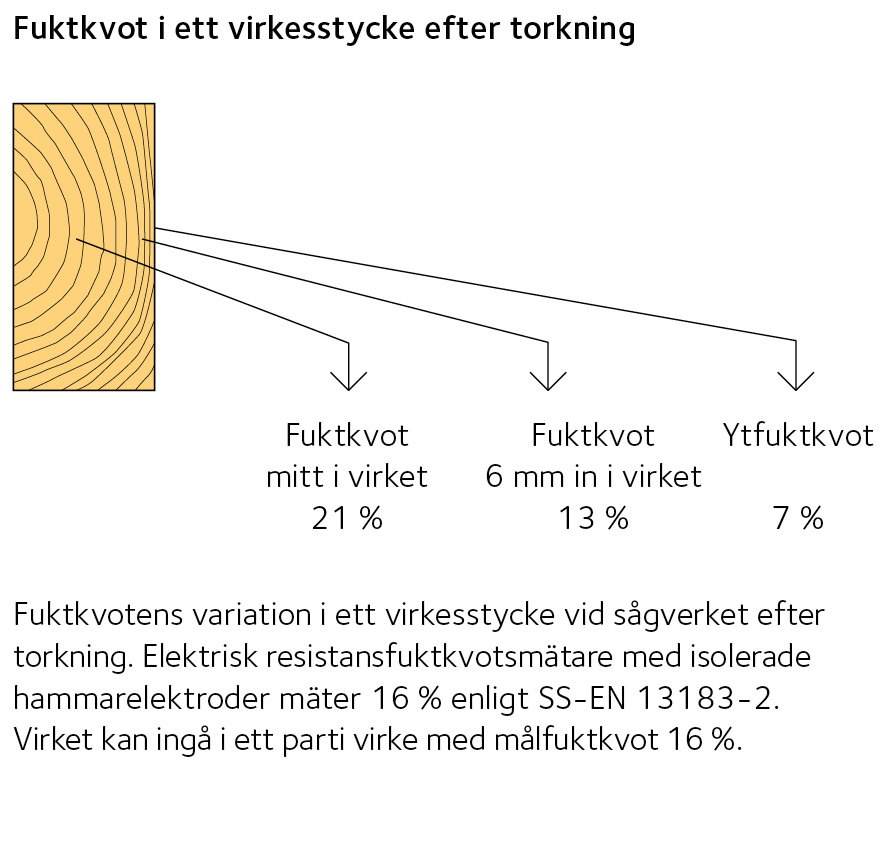 Sågverken torkar virket till olika målfuktkvoter beroende på vad virket ska användas till. Typiska målfuktkvoter vid leverans av olika produkter visas i tabell 10, sidan 41. Fuktkvoten ska vid leverans från sågverket vara anpassad antingen till den fortsatta vidareförädlingen eller till den miljö produkten slutligen ska användas i. Är virket för fuktigt vid leverans kan det leda till deformationer och kassation i senare led. Om virket torkas för mycket leder det till kapacitetsförluster och ökade kostnader för energi och kan påverka kvaliteten och eventuella deformationer vid sågverket.