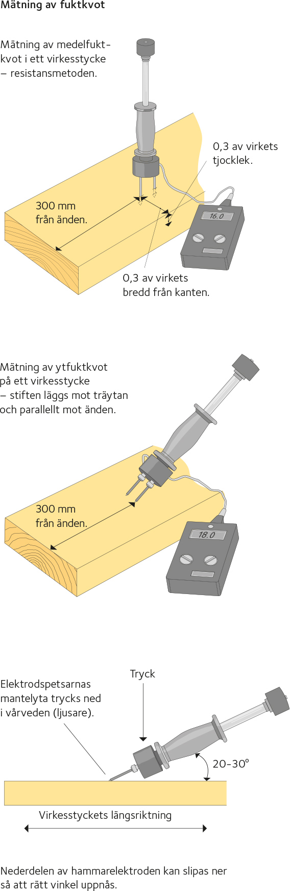 Mät ytfuktkvoten med elektrisk resistansfuktkvotsmätare med isolerade hammarelektroder genom att tvärs fiberriktningen pressa de isolerade hammarelektrodsspetsarnas koniska mantelyta med handkraft ner i virkesytans vårved, så att mätspetsarnas halva mantelytor ger ett avtryck i träet tvärs fiberriktningen. Gör alltid tre mätningar tätt intill varandra på mätstället och beräkna sedan ett medelvärde. Medelvärdet stäms av mot aktuellt krav.