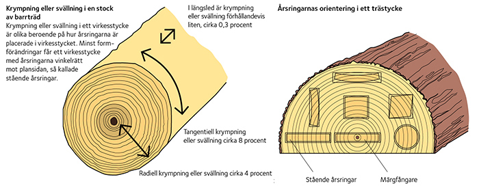 Virket krymper olika mycket i olika riktningar, minst längs med fibrerna och mest längs med årsringarna, se figur 53. Årsringarnas krökning gör att virket kommer att kupa sig och slå sig olika beroende på var i stocken virkesstycket tagits, se figur 54.