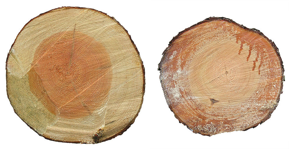Dessa furustockar är nyligen avverkade. Den vänstra bilden visar rotänden och furukärnans utbredning. Den högra bilden visar toppänden och här syns att transporten av näring i form av vätska, som går genom splintveden i stocken, ännu inte har avstannat.