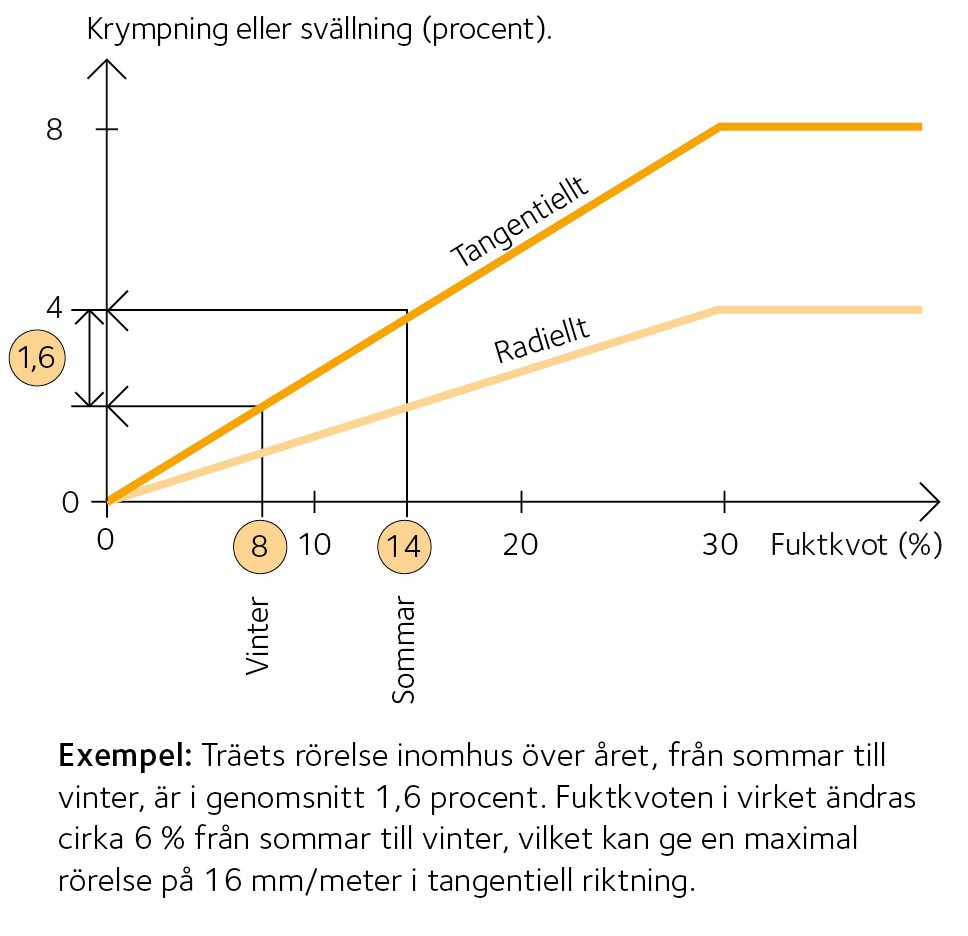 Exempel: En golvbräda med bredden 145 mm och fuktkvoten 17 % läggs in i ett utrymme med ett klimat motsvarande träets jämviktsfuktkvot 10 %. Fuktkvotens förändring 17 − 10 = 7 procentenheter. Brädan krymper 7 × 0,0026 × 145 mm = cirka 2,6 mm i bredd. Krympningen blir hälften så stor om brädan är utsågad i radiell riktning än i tangentiell riktning, det vill säga med stående årsringar. Golvspringorna blir hälften så stora.