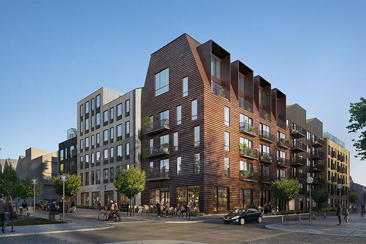 Ett flervåningshus i trä kan stå inflyttningsklart på tio veckor efter det att grundplattan gjutits, tack vare prefabricerade moduler som lyfts på plats och monteras ihop.