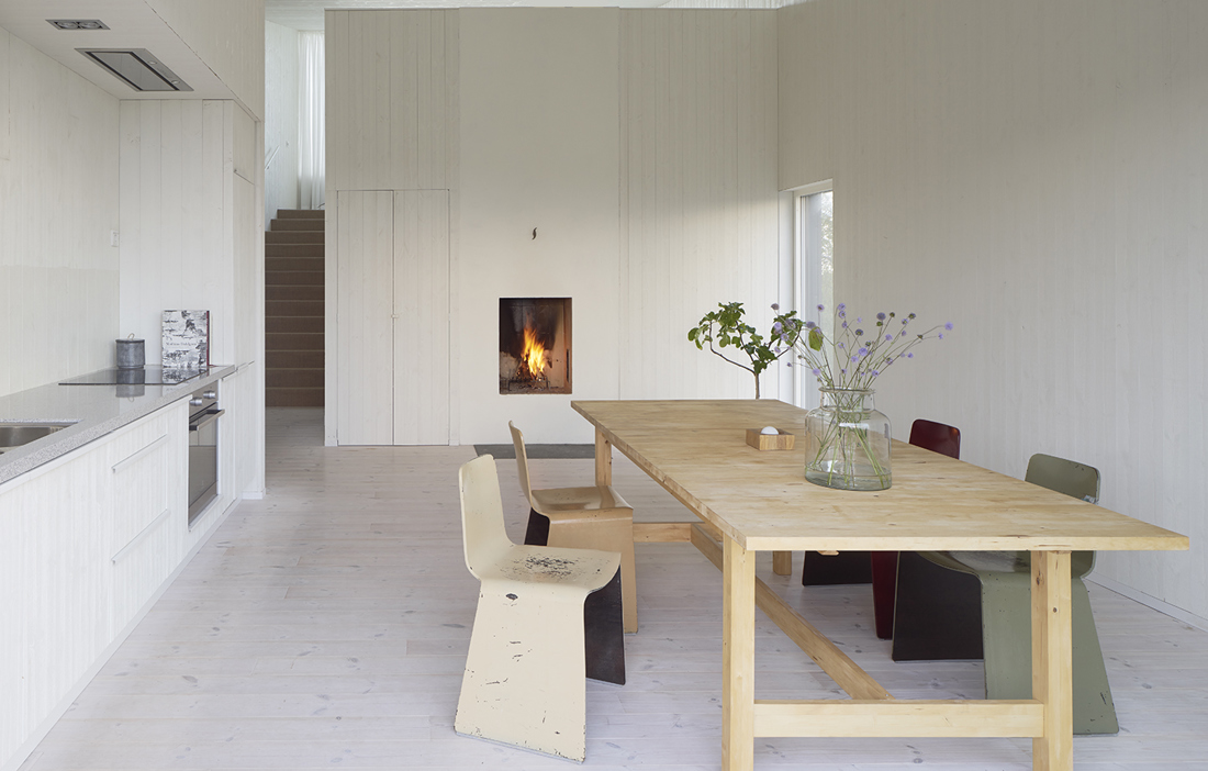 I det här huset har placeringen av byggnaden styrts av utsikten, huset är riktat mot ett sund. Interiören är formad för att samla familjen runt spisen och utsikten. Färgerna är valda för att inte störa. Fritidshus Kyrkesund nominerades till Träpriset år 2016.