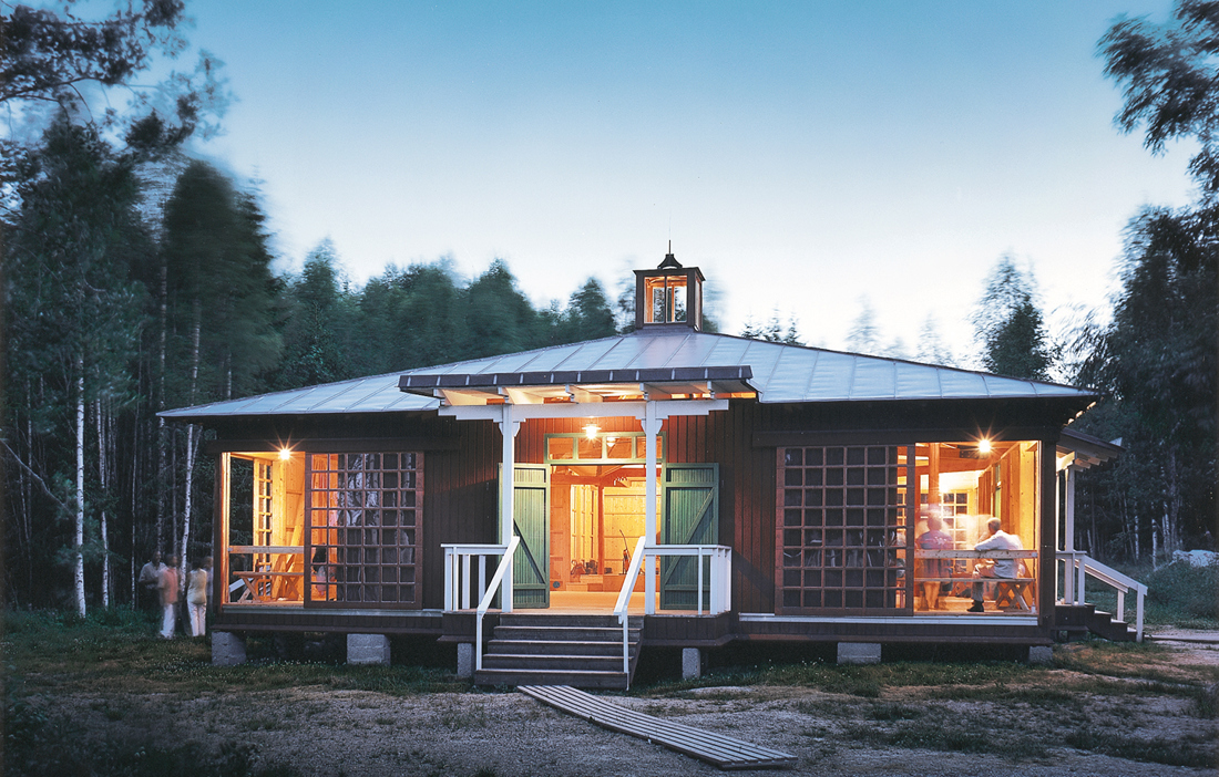 I utkanten av hälsingeskogen ligger dansbanan som en liten rättfram och tillyxad gestalt för dansens och spelmansstämmans turer. Byggnaden visar sina arkitektoniska fördelar i synlig stomme och takkonstruktion, och i stora tunnspröjsade enkelglas. Dansens riter uttrycks med inlevelse i panelhönors hörnbänkar invid skjutfönster och med pausverandor åt tre väderstreck. Detta är en personlig och självständig byggnad utan stora pretentioner - glad och folklig.