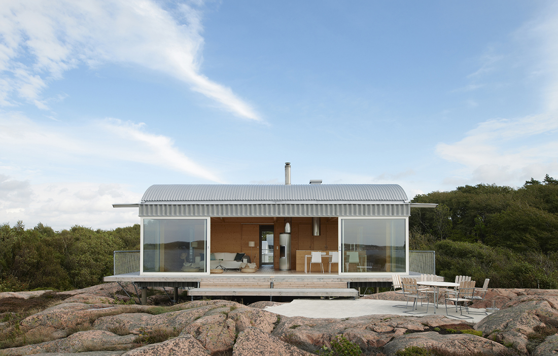 En byggnadskropp sammansatt av två tunnvälvda volymer på en plattform lyft över de Bohusländska klipporna är ett exempel på förnyelse av modern skärgårdsarkitektur. Den platsbyggda trästommen av massivt konstruktionsvirke och stolpar och balkar av limträ, har fått en närmast underhållsfri, mineralisk utsida. Till skillnad från de yttre materialen är byggnadernas inre rum helt av trä. När solen står lågt i väster blir den grå byggnaden i det granitgrå landskapet ett glödande blickfång från havet.